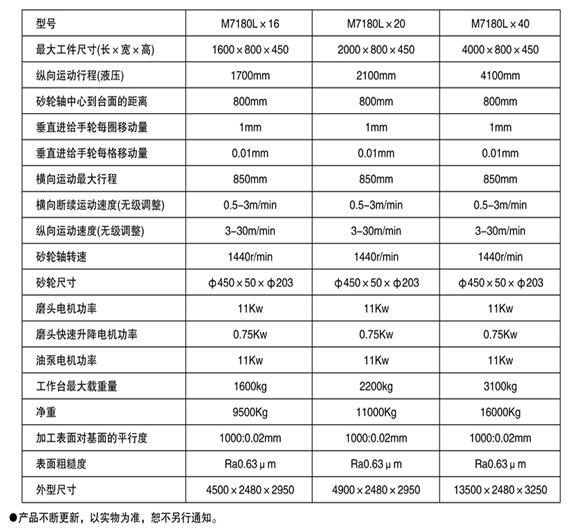 性能及工作特点: 此平面磨床以砂轮周边或侧面磨削工件的平面,工件可以固定在工作台上,或吸牢在电磁吸盘上,其材质可以是钢、铸铁、石墨、或有色金属。机床工作台的左右和磨头的前后运动都是用液压驱动,无极调速。磨头的前后运动也可手动操作。磨头的垂直方向除手动进刀外还配有快速升降机构,减轻劳动强度提高效率。 主要技术规格参数
